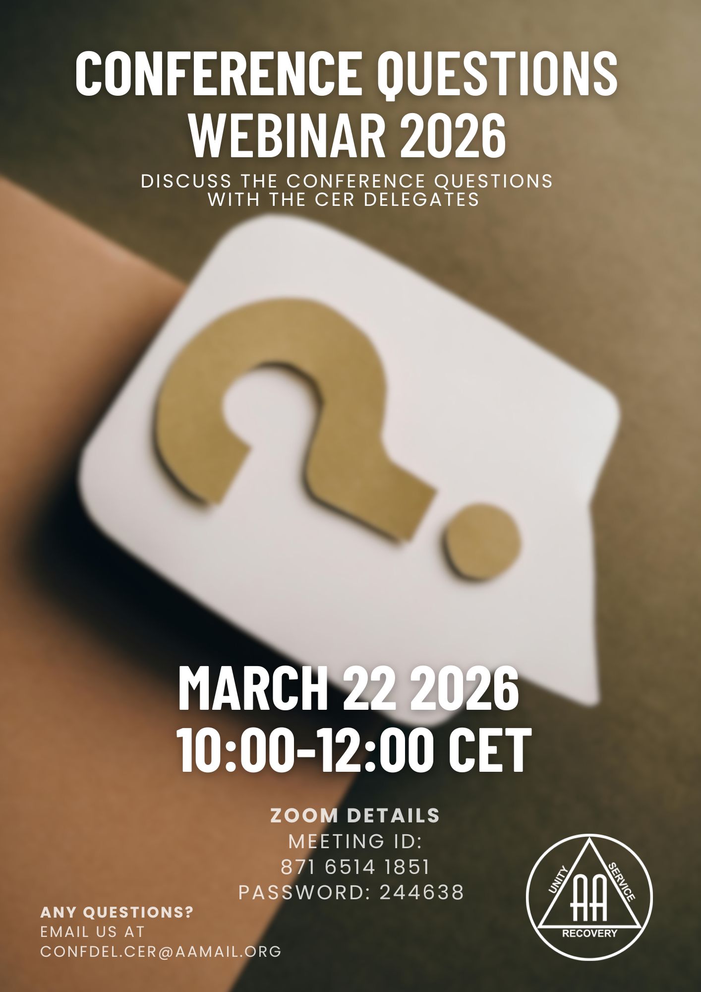 Online ZoomIn this webinar, the CER delegates that attended this year's AA General Service Conference in York UK, will present the recommendations that resulted from the questions to Conference. https://us02web.zoom.us/j/995811178