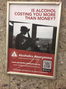 It was great timing that AA Great Britain had just released four new posters with the tagline “DOES ALCOHOL COST YOU MORE THAN MONEY?”. We found the motifs and message to be particularly strong and powerful. We customized the posters by adding the details of the CER website and help email address, and our own QR-code along with the note “Scan here for daily meetings in Munich”.